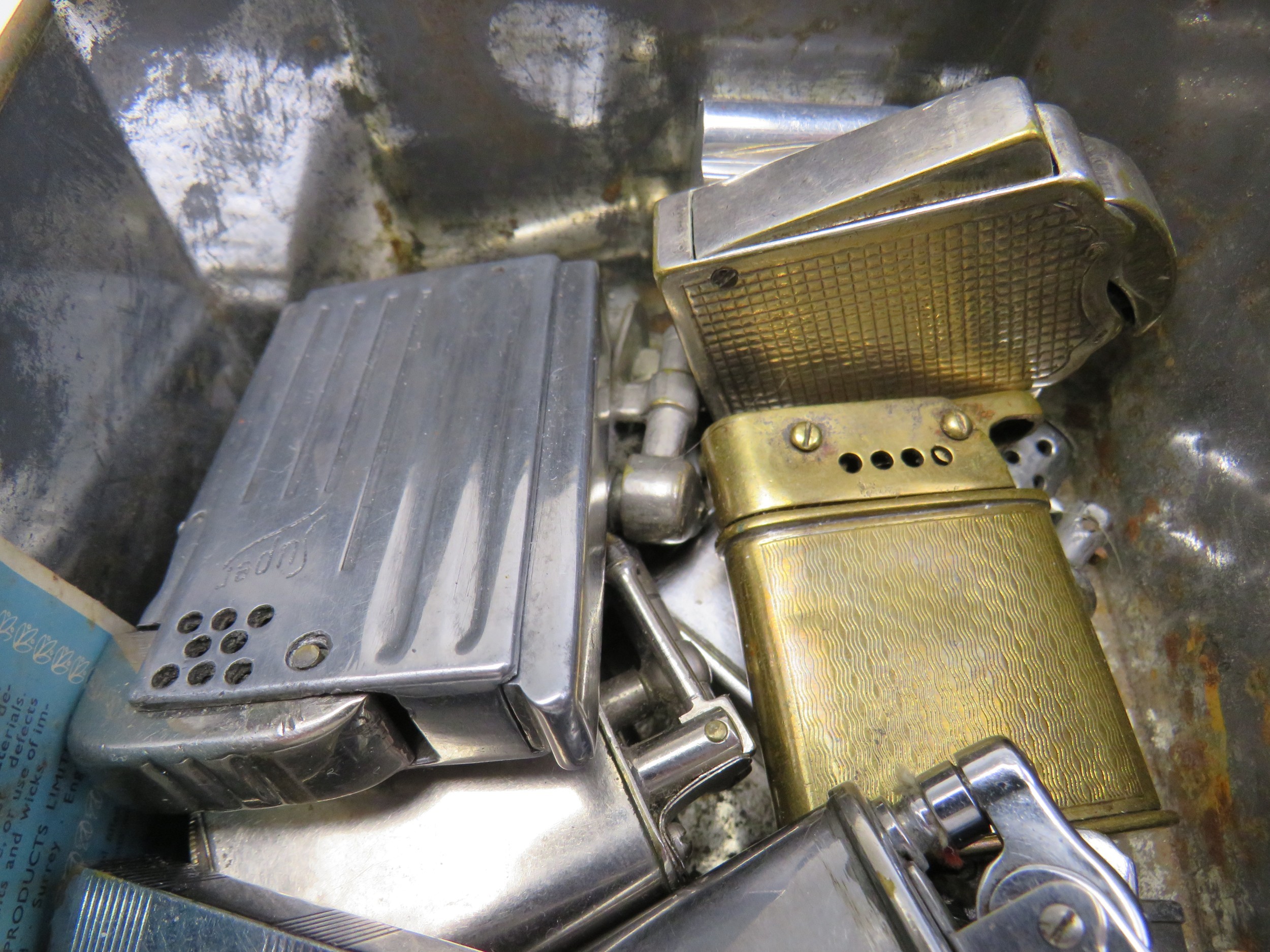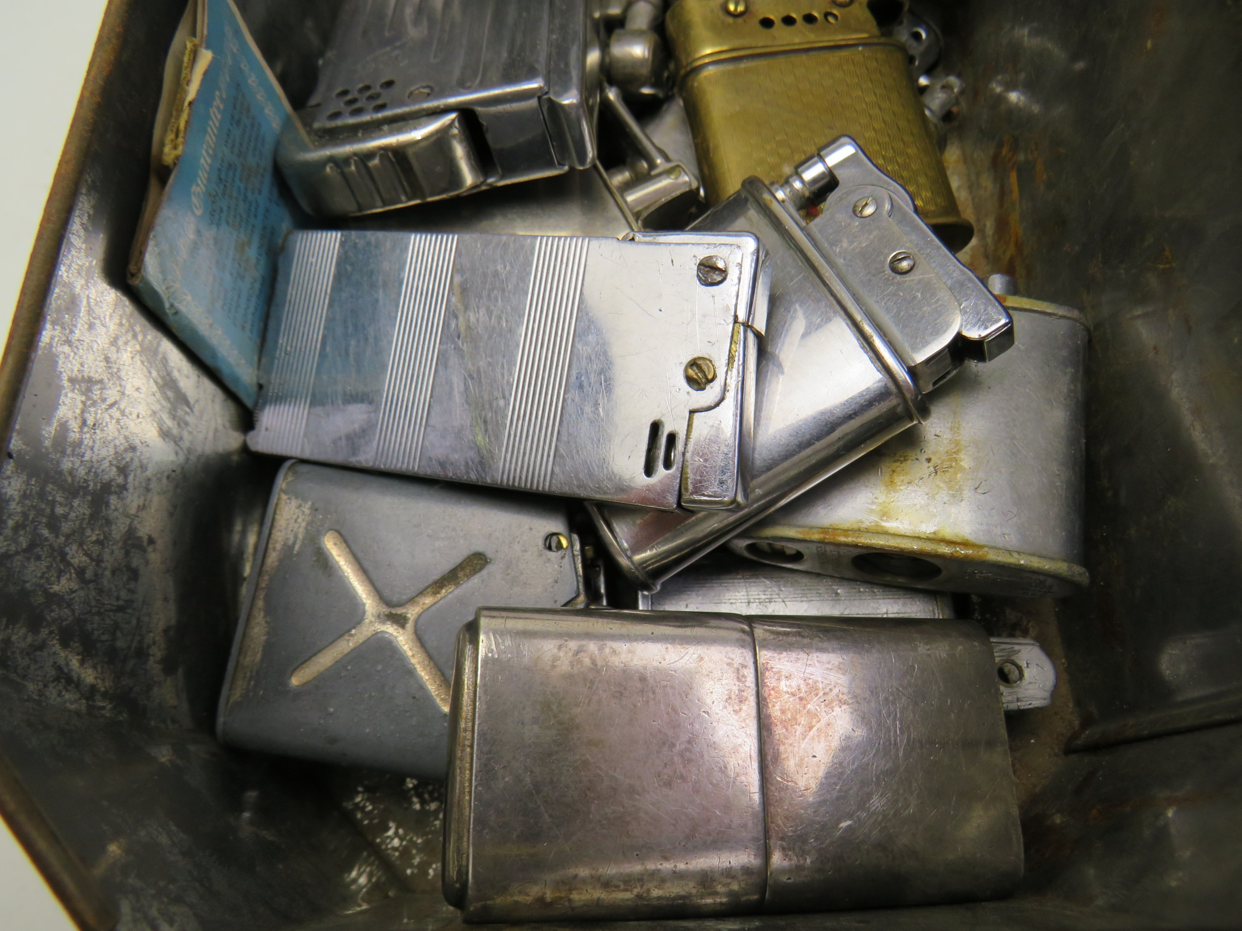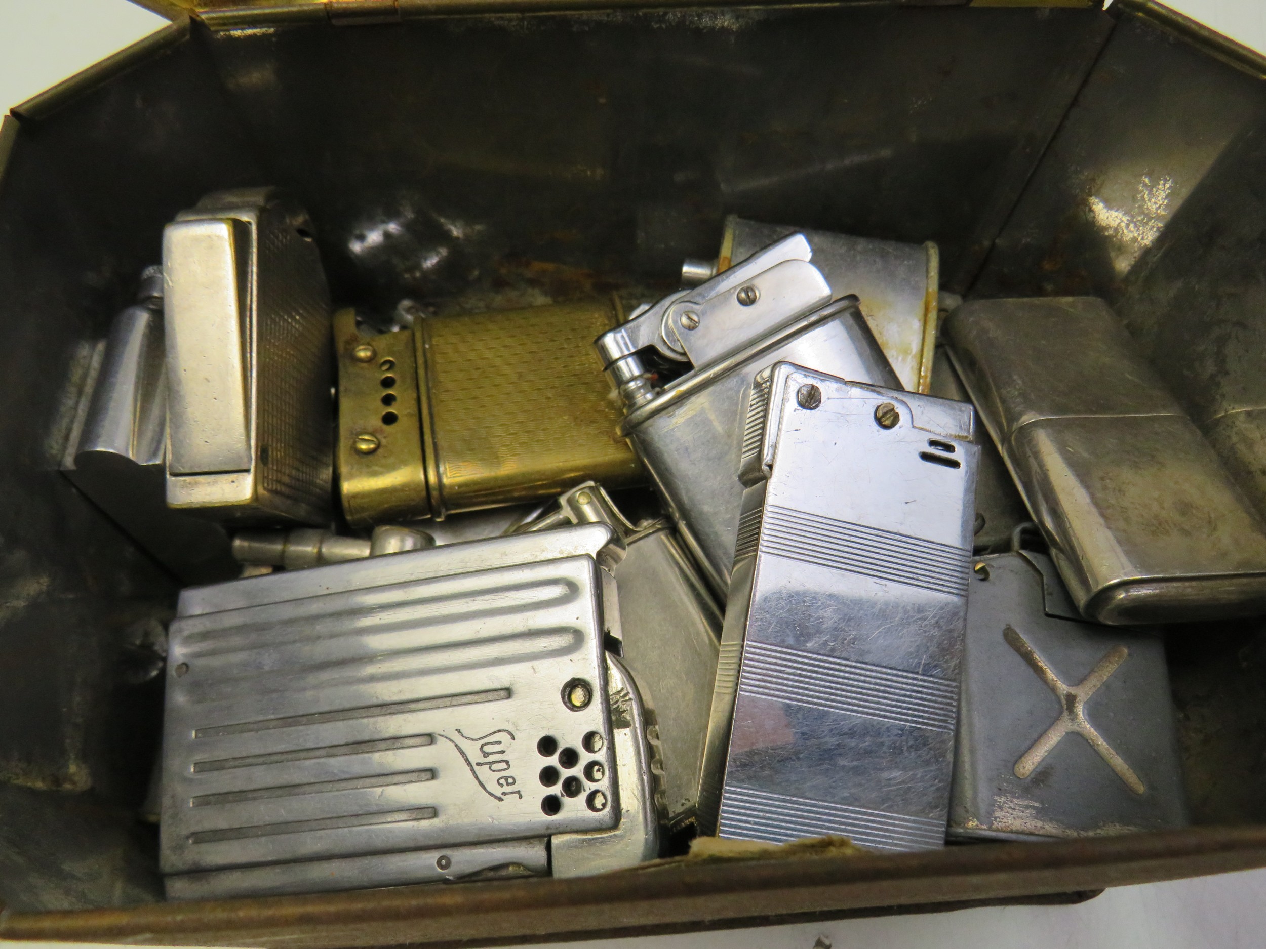 Tin box with fifteen mixed lighters, Howitt, super, Parker Quercia